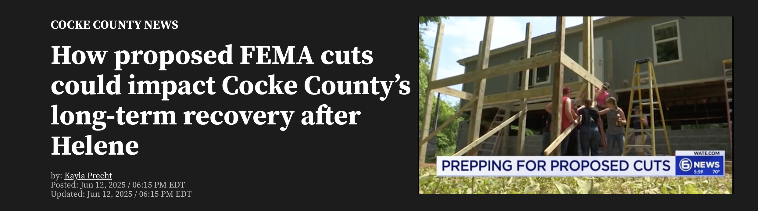 WVLT8 Article discusses the struggles of repairing homes affected by Hurricane Helene. https://www.wvlt.tv/2025/05/18/cocke-county-property-assessor-explains-recent-confusion-repairing-homes-affected-by-helene