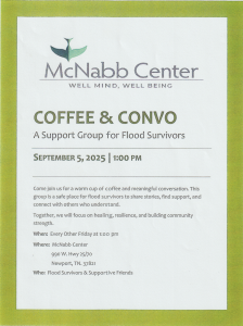 Come join us for a warm cup of coffee and meaningful conversation. This group is a safe place for flood survivors to share stories, find support, and connect with others who understand.
